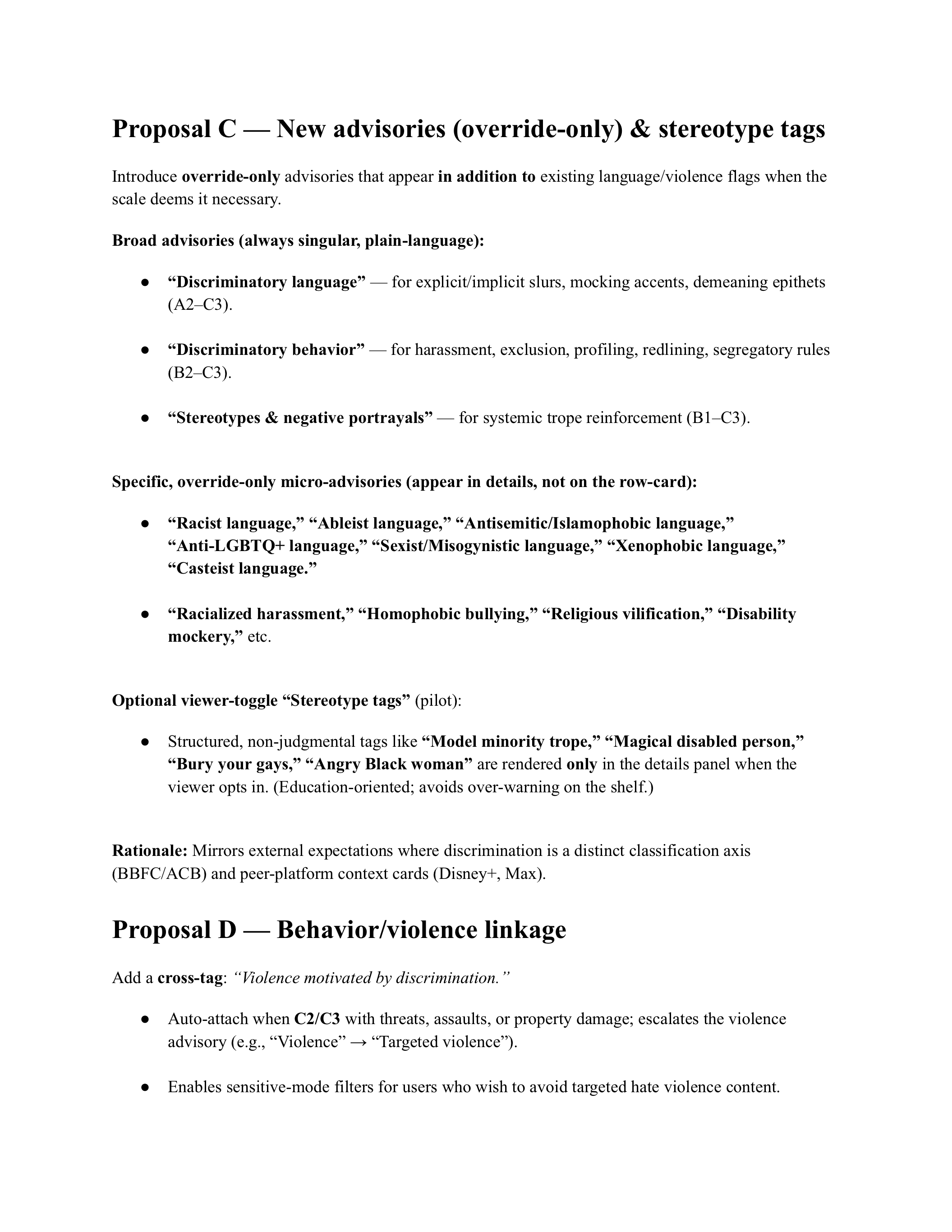 Recommended override-only advisories and stereotype tags to improve content transparency.